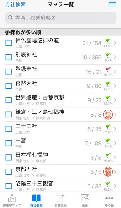 因みにご朱印帳の整理はこのアプリを愛用してます。写真を上げると撮影時刻反映してくれるし、ご朱印帳ごとや日付順にソートしたり霊場や都道府県順で参拝の割合見られたりするからとっても便利。最寄りの札所検索も出来ます。 apps.apple.com/jp/app/%E5%BE%…