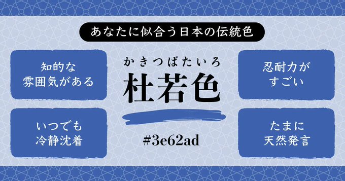 あなたに似合う日本の伝統色は 【杜若色】です ✔️知的な雰囲気 ✔️いつでも冷静沈着 ✔️忍耐力がすごい ✔️たまに天然発言 #あなたを伝統色に例えると #ホイミー buff.ly/32mFIuK pic.twitter.com/sWhyd3IEpD