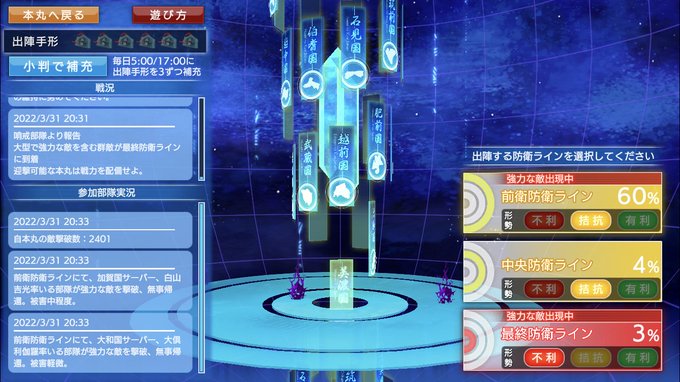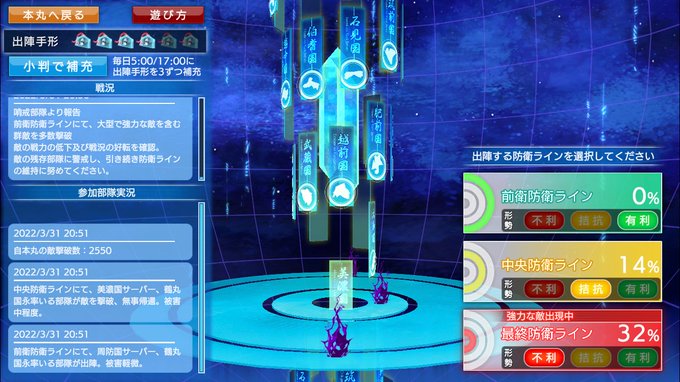 RT @digitarou: 会議終わって本丸に戻るとすでに前衛はグリーンシグナル。敵の侵寇第一波のときよりも早いような気がします。これが守護リラ審神者の力。。これより我が本丸も参戦します。 #刀剣乱舞 #防人作戦