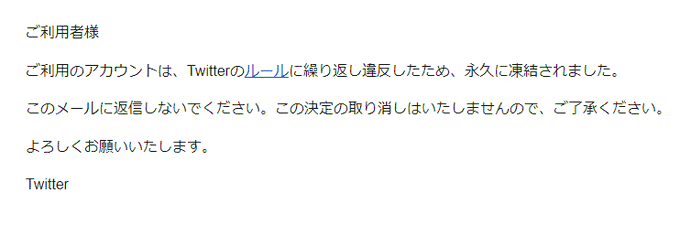 サブアカの方、突然の永久凍結からの異議申し立てしたら 何回もルール違反してるから永久凍結でこの決定は覆らんからもうメールしてくんなって言って来たんだけど凍結は解除されてるんだよね…。どういうことなのマジで pic.twitter.com/h9SUB1dqIt