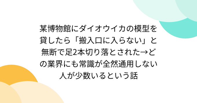 某博物館にダイオウイカの模型を貸したら「搬入口に入らない」と無断で足2本切り落とされた→どの業界にも常識が全然通用しない人が少数いるという話 buff.ly/3Y5FaQG #Togetter pic.twitter.com/D66dPWhYjp
