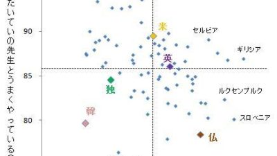 deli-hell-me: データえっせい: 日本の生徒の対教師関係 しかるに,日本のイレギュラー性は際立っており,左下の極地にあります。教師の言うことを聞く生徒は多いが,その一方で,教師と良好な関 …